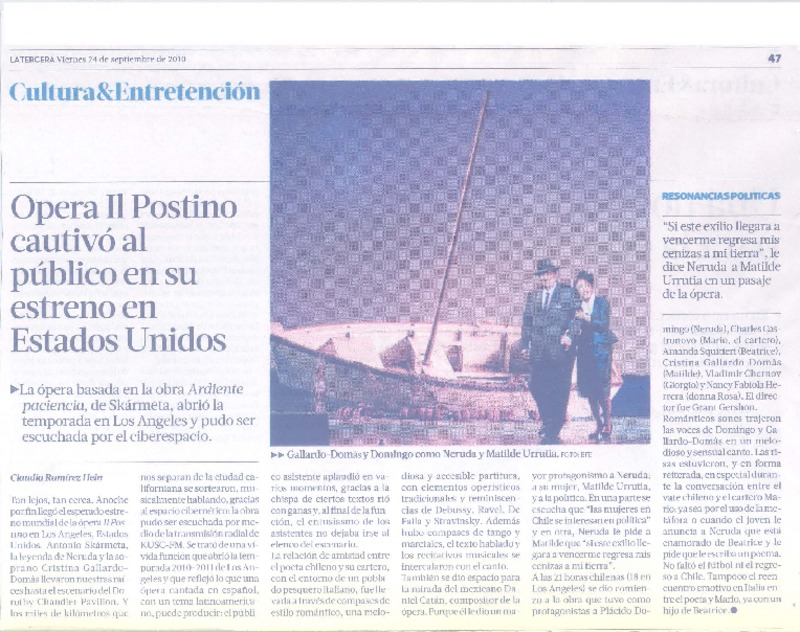 Ópera Il Postino cautivó al público en su estreno en Estados Unidos [artículo] Claudia Ramírez Hein.