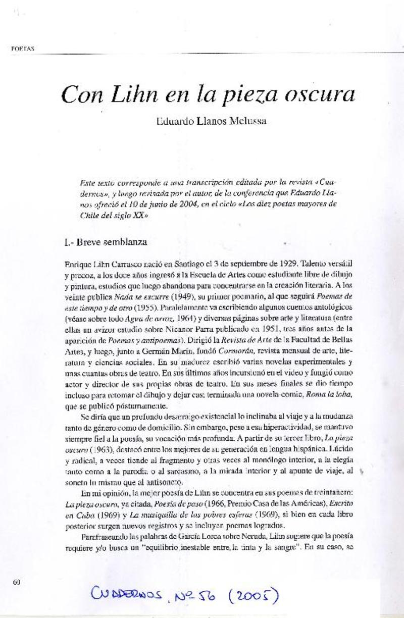 Con Lihn en la pieza oscura [artículo] Eduardo Llanos Melussa.