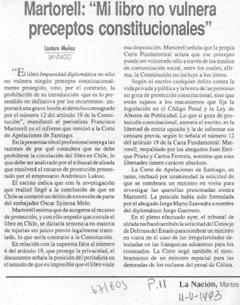 Martorell: "Mi libro no vulnera preceptos constitucionales" [artículo] Lautaro Muñoz.