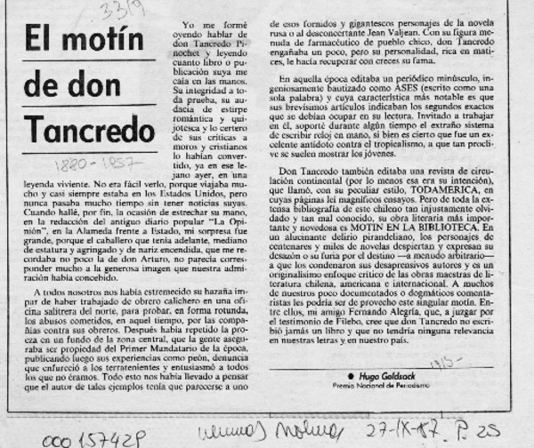 El motín de don Tancredo [artículo] Hugo Goldsack.