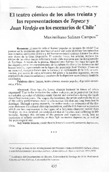 El teatro cómico de los años treinta y las representaciones de Topaze y Juan Verdejo en los escenarios de Chile [artículo] Maximiliano Salinas Campos.