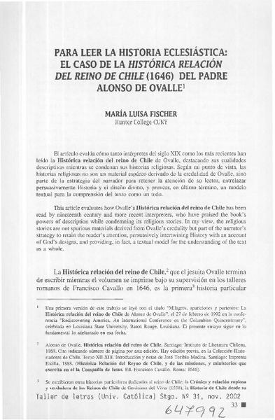 Para leer la historia eclesiástica, el caso de la Histórica relación del reino de Chile (1646) del Padre Alonso de Ovalle [artículo] María Luisa Fischer
