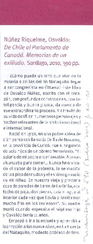 Autores chilenos - Núñez Riquelme, Osvaldo - De Chile al Parlamento de Canadá
