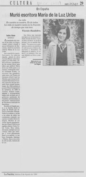 Murió escritora María de la Luz Uribe [artículo] Paulina Valente.
