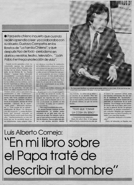 Luis Alberto Cornejo; "En mi libro sobre el Papa traté de describir al hombre" : [entrevista] [artículo] Pacián Martínez.
