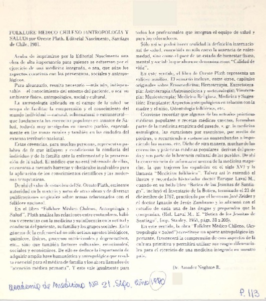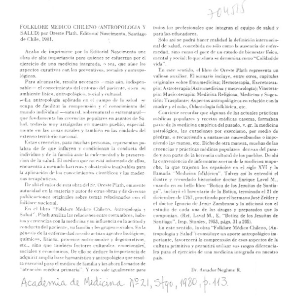 Folklore médico chileno (antropología y salud) [artículo] Amador Neghme R.