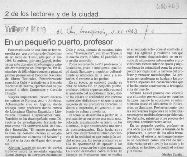 Autoras chilenas - Lassel, Adriana - En un pequeño puerto, profesor