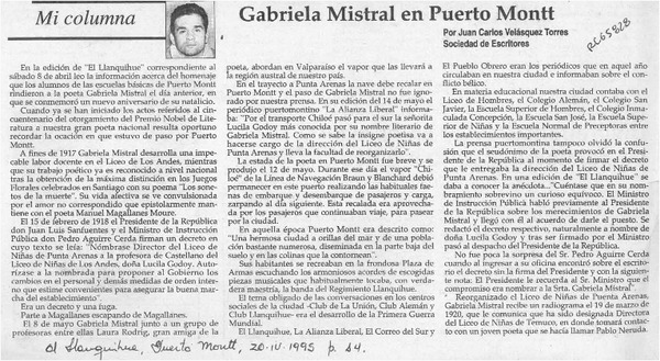 Gabriela Mistral en Puerto Montt [artículo] Juan Carlos Velásquez Torres.