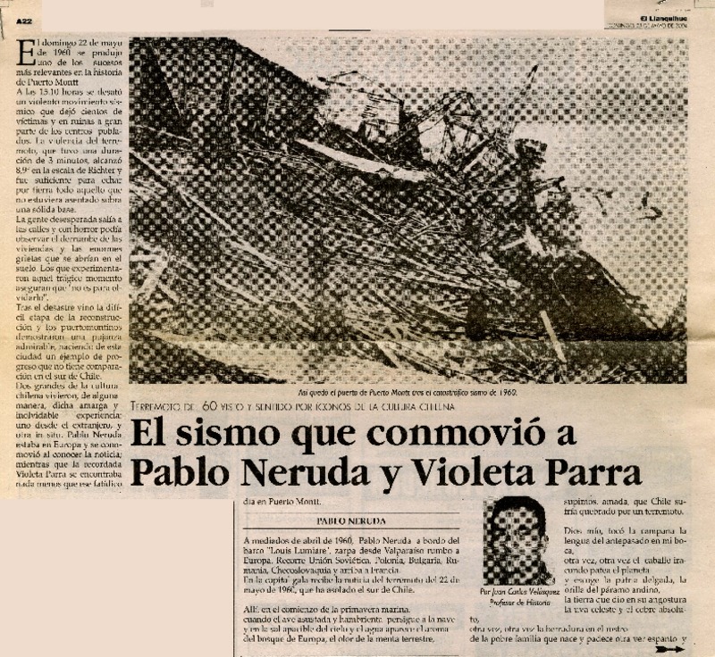 El sismo que conmovió a Pablo Neruda y Violeta Parra Terremoto del 60 visto y sentrido por íconos de la cultura chilena [artículo] : Juan C. Velásquez T.