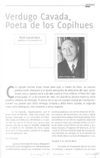 Verdugo Cavada, poeta de los Copihues [artículo] René Louvel Bert.