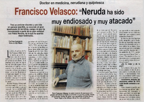 Francisco Velasco: "Neruda ha sido muy endiosado y muy atacado" [entrevistas] [artículo] : Piero Castagneto.