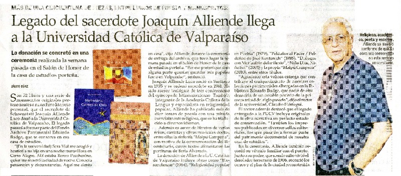 Legado del sacerdote Joaquín Alliende llega a la Universidad Católica de Valparaíso [artículo] iñigo Díaz.
