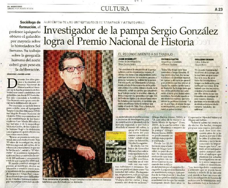 Investigador de la pampa Sergio González logra el Premio Nacional de Historia [artículo] Iñigo Díaz y Davied Jaime