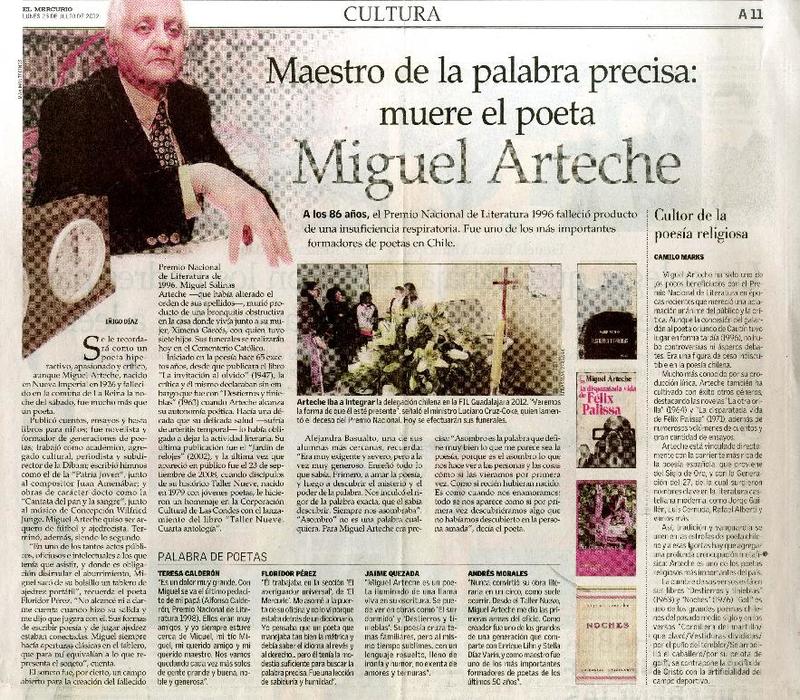 Maestro de la palabra precisa: muere el poeta Miguel Arteche [artículo] Iñigo Díaz.