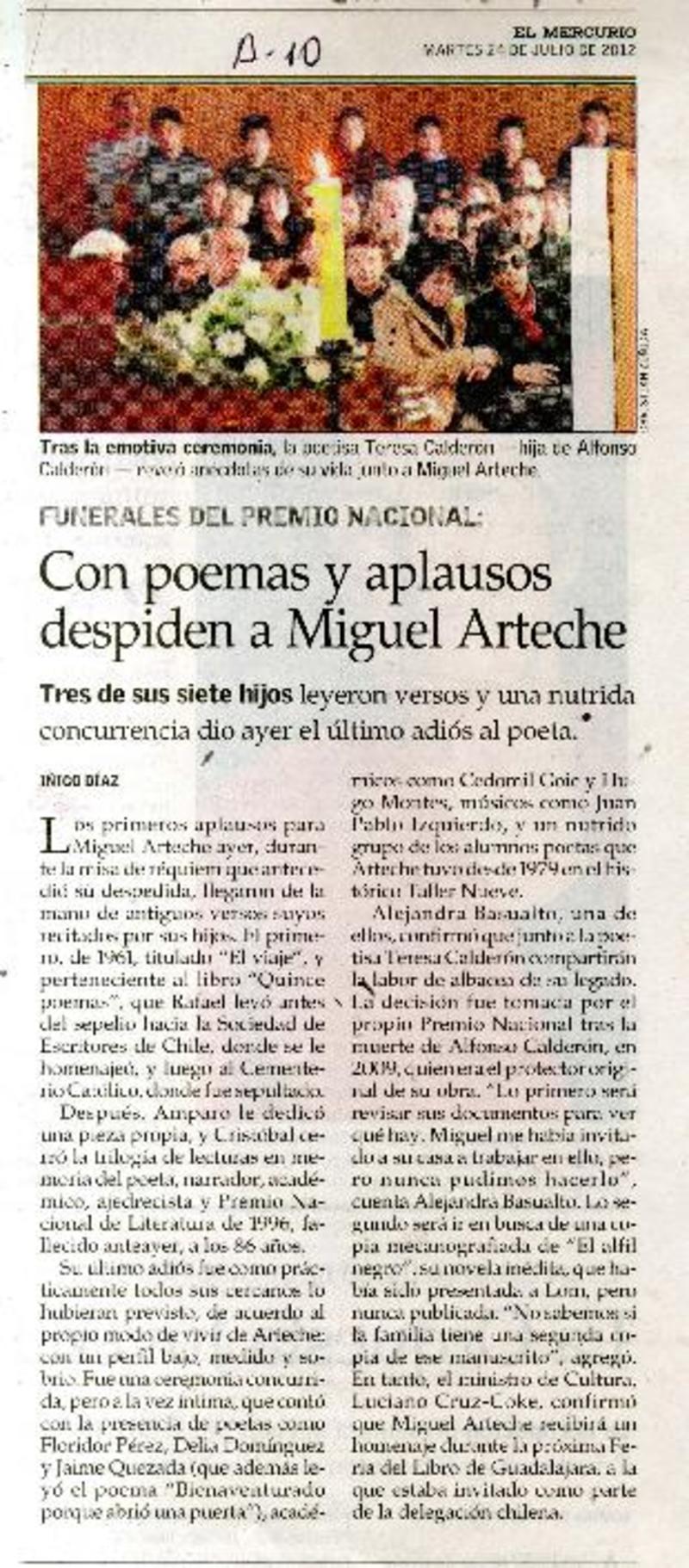 Con poemas y aplausos despiden a Miguel Arteche [artículo] Iñigo Díaz.