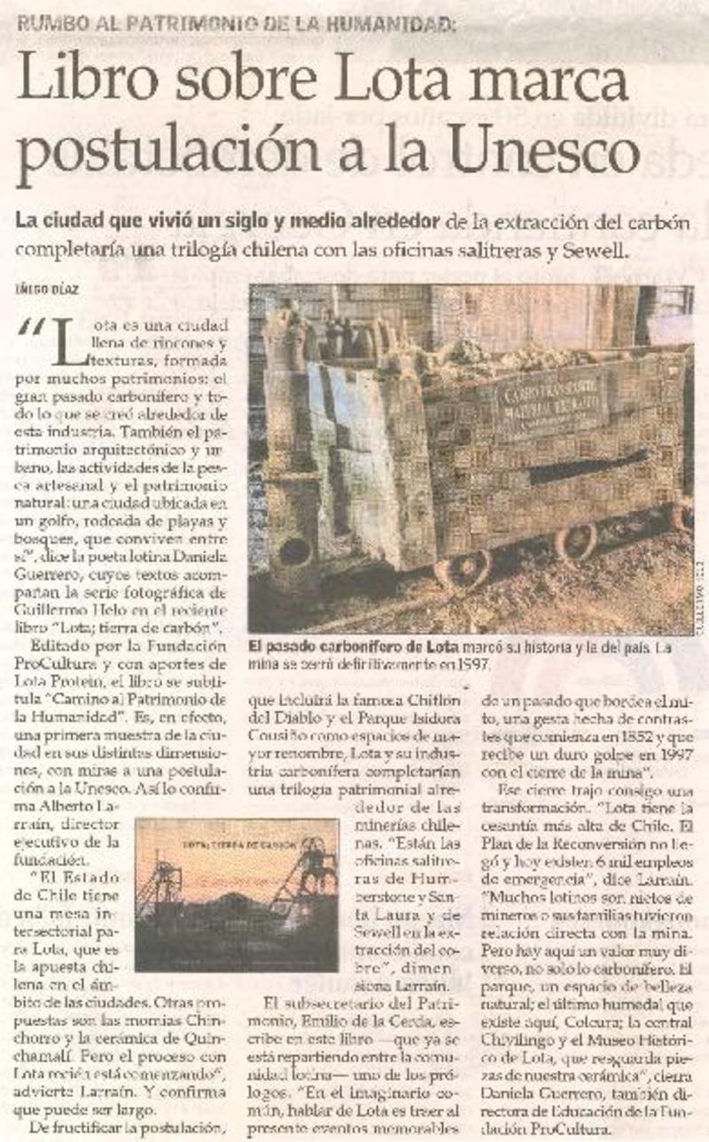 Libro sobre Lota marca postulación a la Unesco [artículo] Iñigo Díaz.