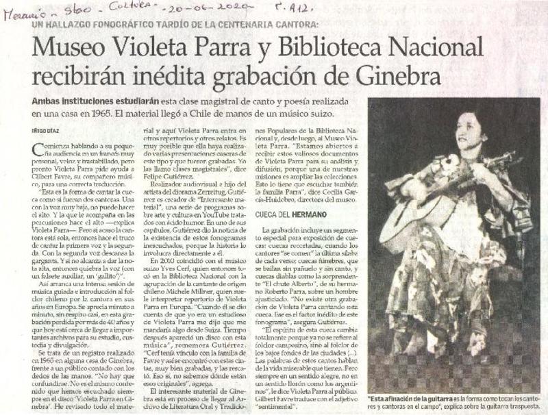 Museo Violeta Parra y Biblioteca Nacional recibirán inédita grabación de Ginebra [artículo] Iñigo Díaz.