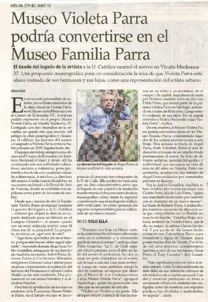 Museo Violeta Parra podría convertirse en el Museo Familia Parra [artículo] Iñigo Díaz.