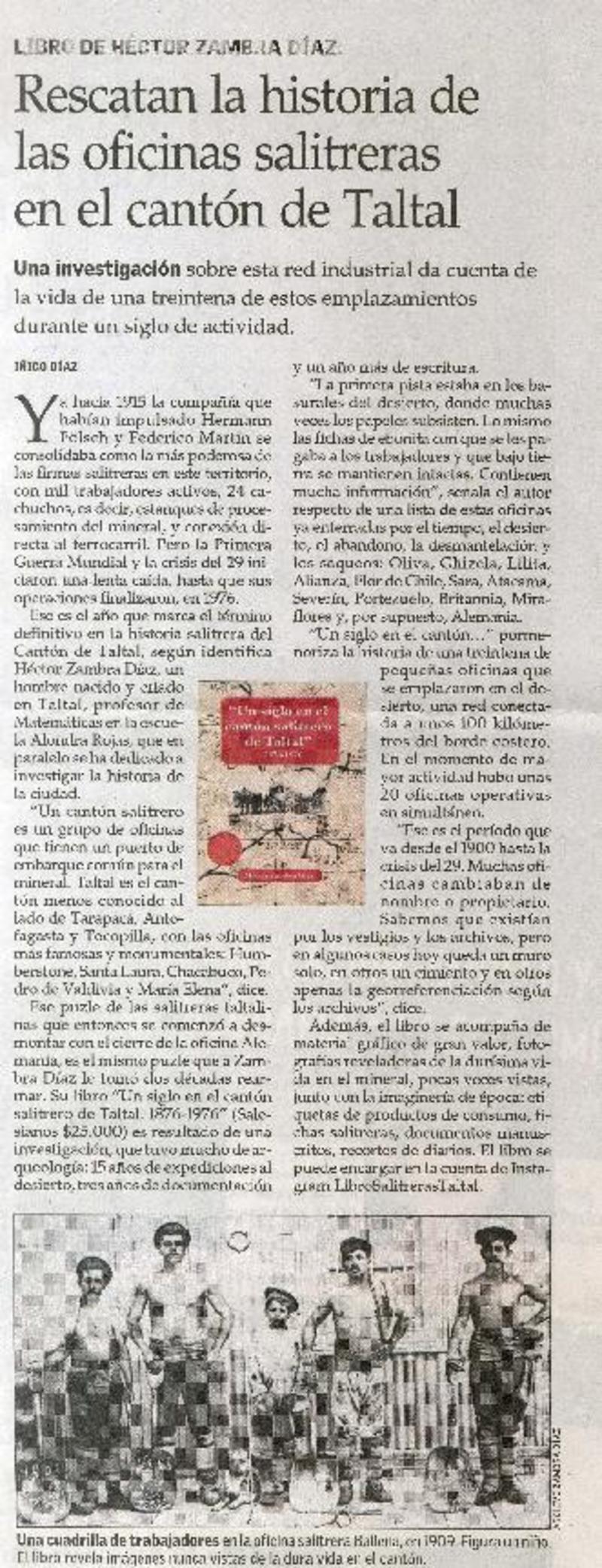 Rescatan la historia de las oficinas salitreras en el cantón de Taltal [artículo] Iñigo Díaz,