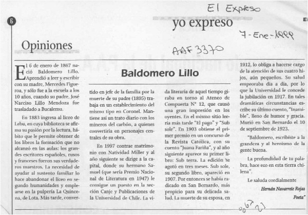 Baldomero Lillo [artículo] Hernán Navarrete Rojas.