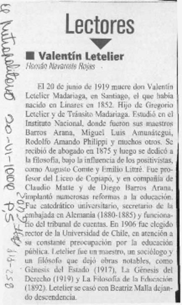 Valentín Letelier [artículo] Hernán Navarrete Rojas.