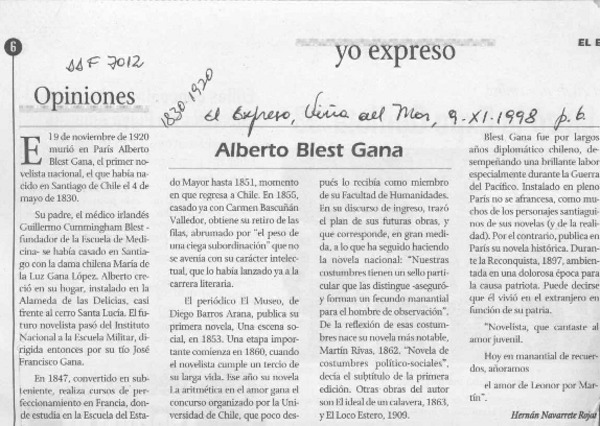 Alberto Blest Gana [artículo] Hernán Navarrete Rojas.