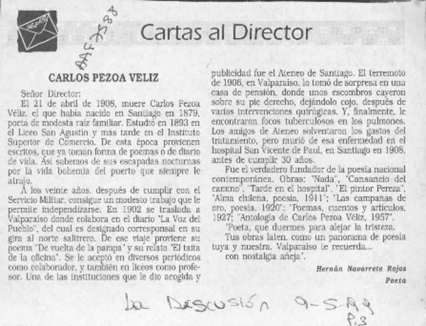 "Carlos Pezoa Véliz" [artículo] Hernán Navarrete Rojas.