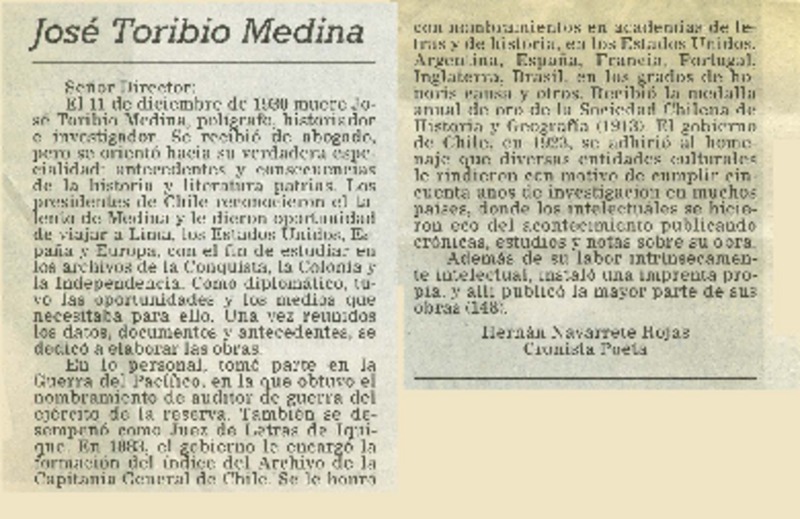 José Toribio Medina [artículo] Hernán Navarrete Rojas