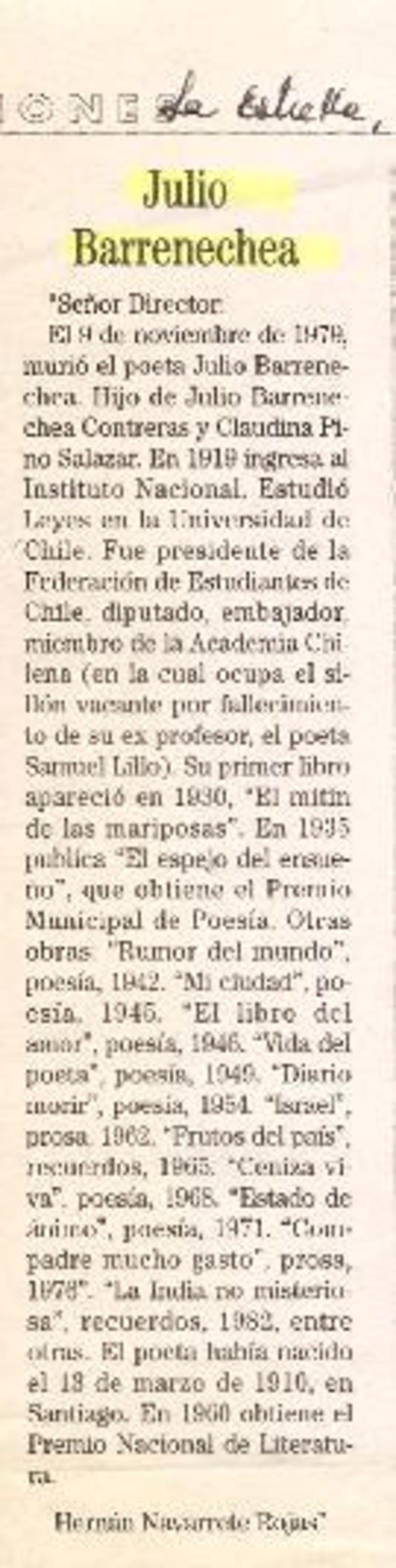 Julio Barrenechea [artículo] Hernán Navarrete Rojas.