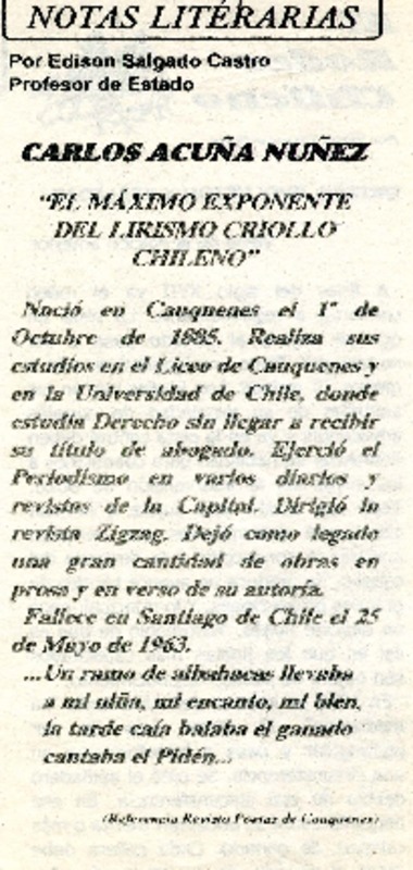 Carlos Acuña Núñez : "el máximo exponente del lirismo criollo chileno" [artículo] Edison Salgado Castro.