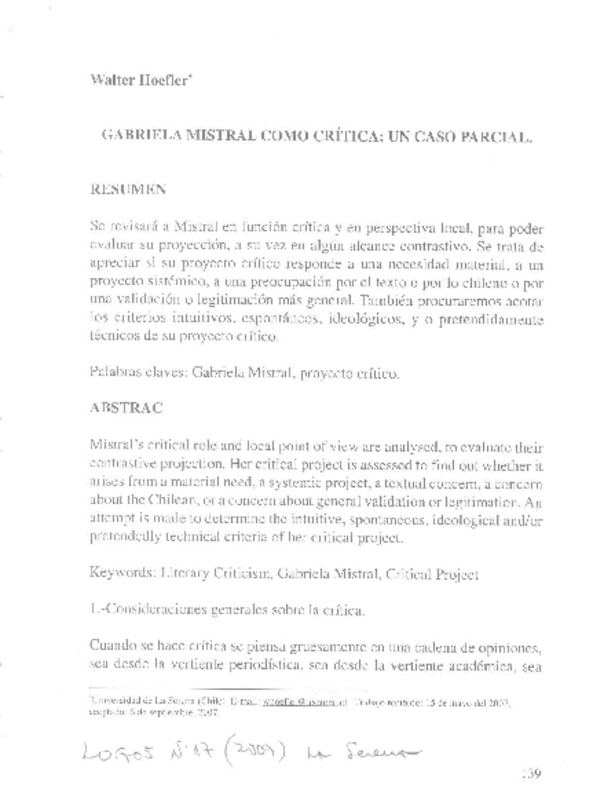 Gabriela Mistral como crítica [artículo] Walter Hoefler.