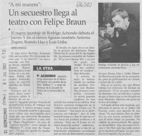 Un secuestro llega al teatro con Felipe Braun [artículo] Andrea González.