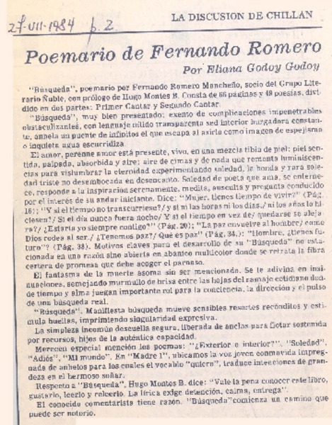 Poetisa penquista comenta la obra de un colega de Ñuble [comentario] [artículo] Eliana Godoy Godoy.