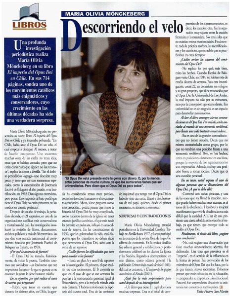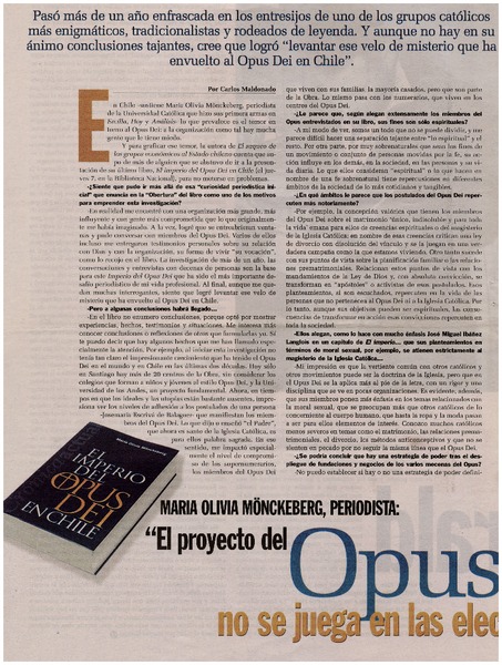 María Olivia Mönckeberg desmenuza al Opus Dei : [entrevistas] [artículo] S.B.