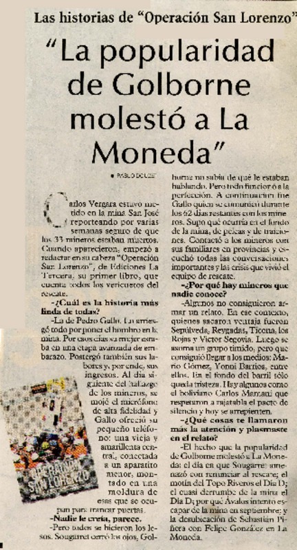 "La popularidad de Golborne molestò a la Moneda" (entrevista) [artículo] Pablo Douzet.