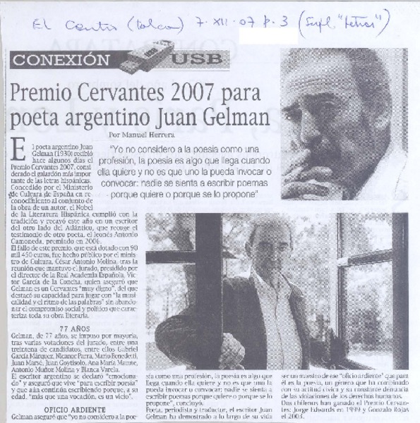 Premio Cervantes 2007 para poeta argentino Juan Gelman [artículo] Manuel Herrera.