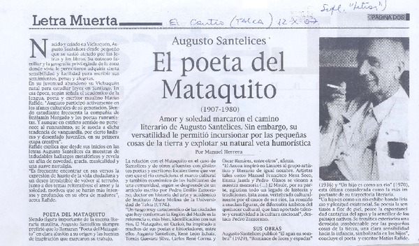 Augusto Santelices. El poeta del Mataquito [artículo] Manuel Herrera.