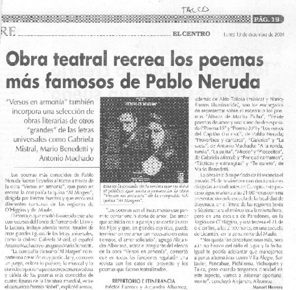 Obra teatral recrea los poemas más famosos de Pablo Neruda [artículo] Manuel Herrera