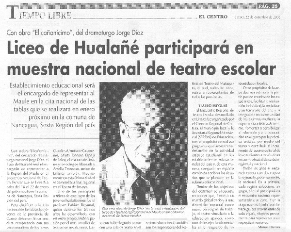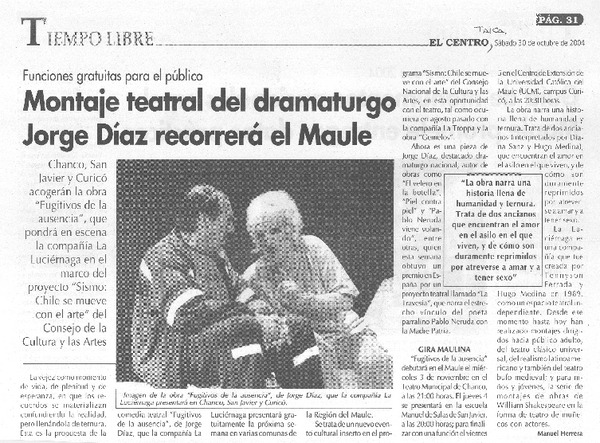 Montaje teatral del dramaturgo Jorge Díaz recorrerá el Maule [artículo] Manuel Herrera