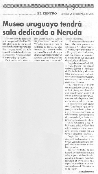 Museo uruguayo tendrá sala dedicada a Neruda [artículo] Manuel Herrera