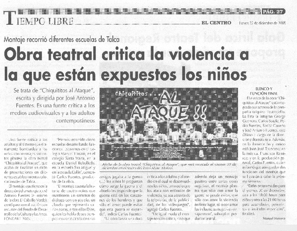 Obra teatral critica la violencia a lo que están expuestos los niños [artículo] Manuel Herrera