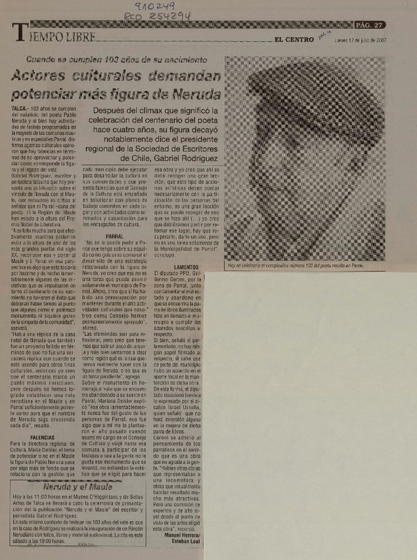 Actores culturales demandan potenciar más figura de Neruda [artículo] Manuel herrera <y> Esteban Leal.
