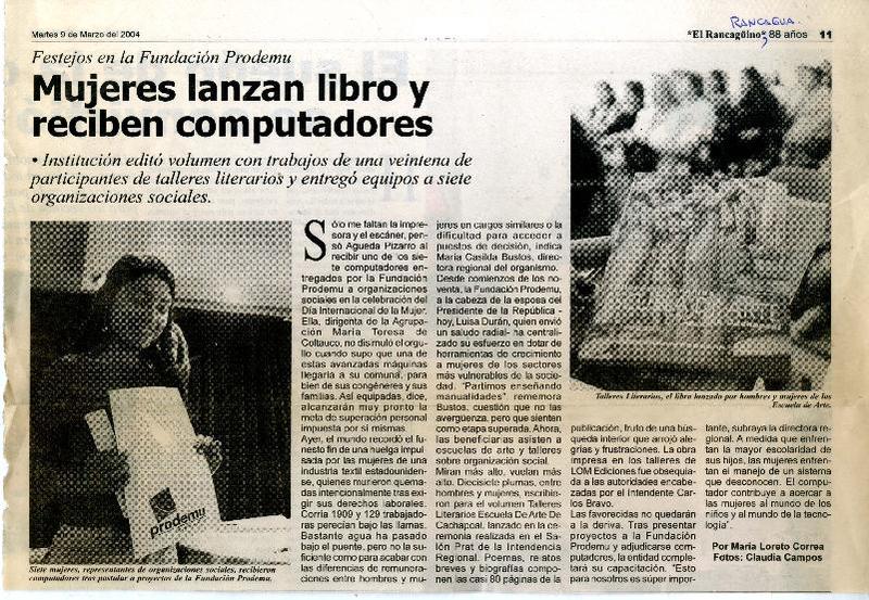 Mujeres lanzan libro y reciben computadores Festejos en la fundación PRODEMU [artículo] : María Loreto Correa.
