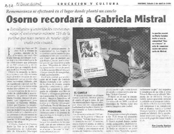 Osorno recordará a Gabriela Mistral [artículo] Loreto Bustos.
