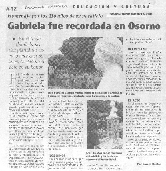 Gabriela fue recordada en Osorno. [artículo] Loreto Bustos