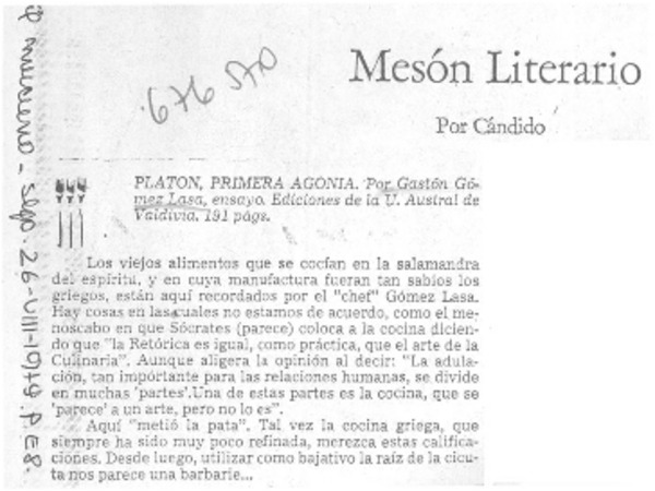 Autores chilenos - Gómez Lasa, Gastón - Platón, primera agonía