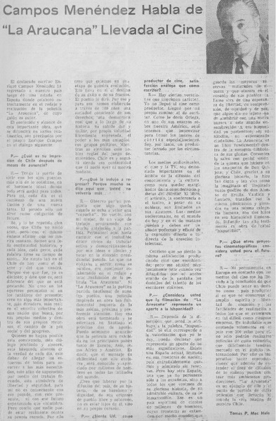 Campos Menéndez habla de "La Araucanía" llevada al cine : [Entrevista] [artículo] Tomás P. Mac Hale.