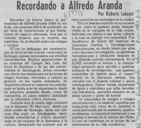 Recordando a Alfredo Aranda [artículo] Roberto Lehnert.