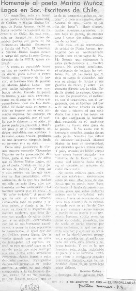 Homenaje al poeta Marino Muñoz Lagos en Soc. Escritores de Chile [artículo] Hernán Cañas.