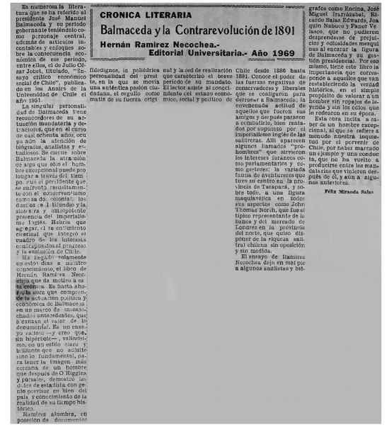 Balmaceda y la contrarevolución de 1891 [artículo] Félix Miranda Salas.
